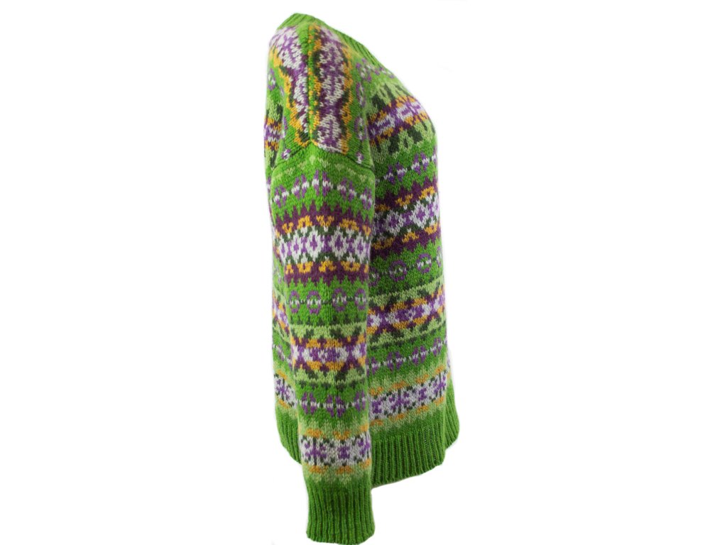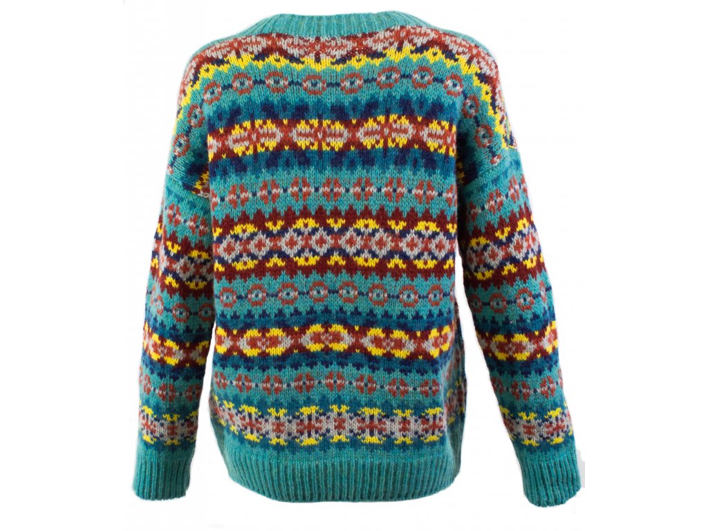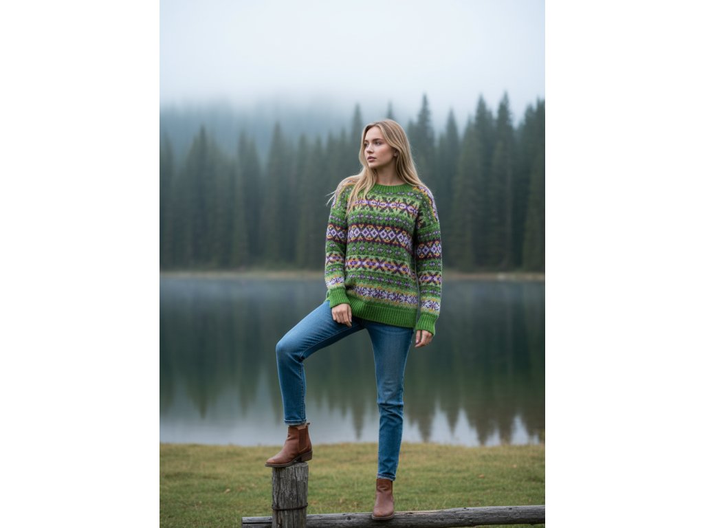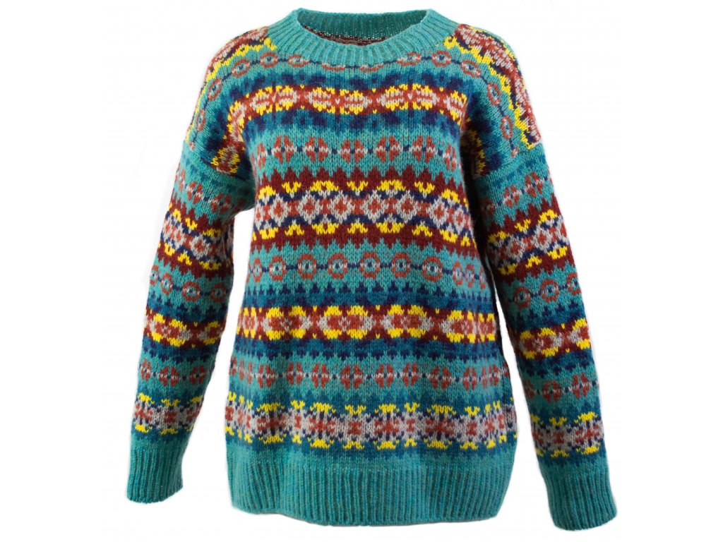 Výrazný dámský svetr z pravé 100% shetlandské vlny, která je známá svou pevností, hřejivostí a přirozenou odolností vůči větru i vlhkosti.