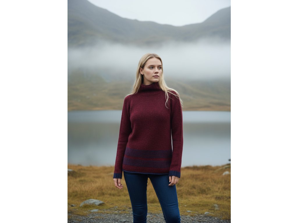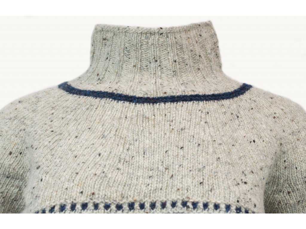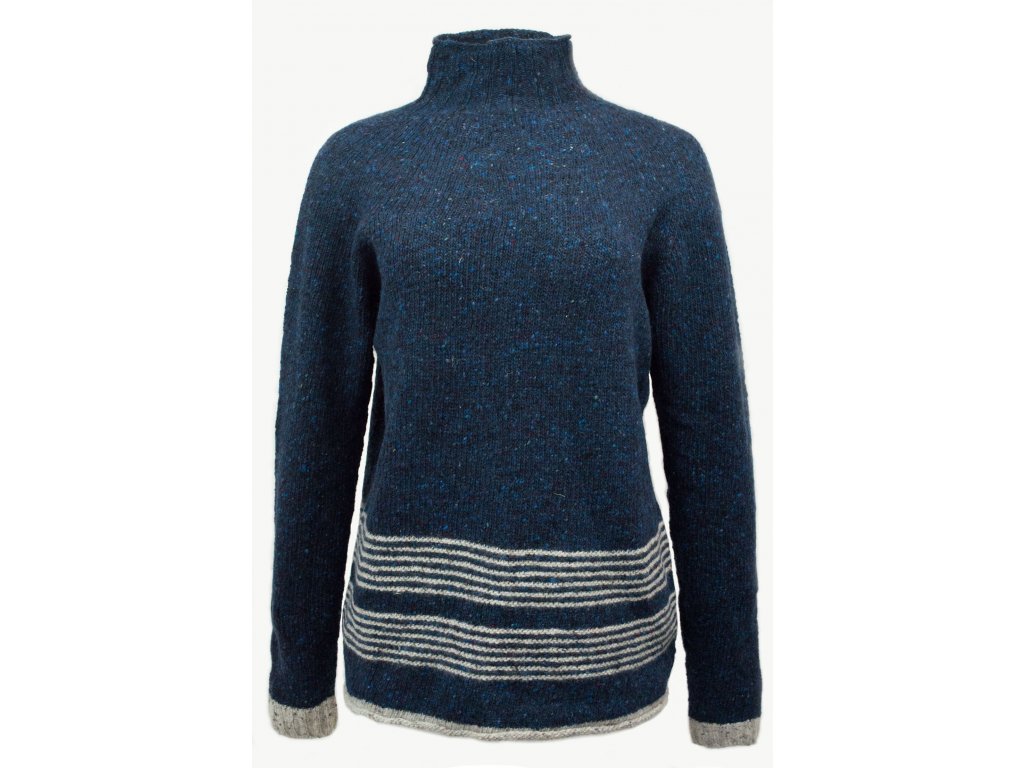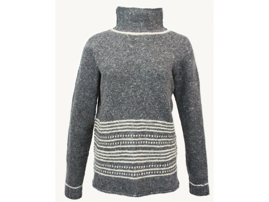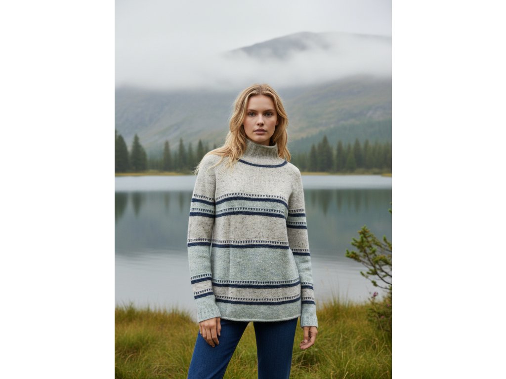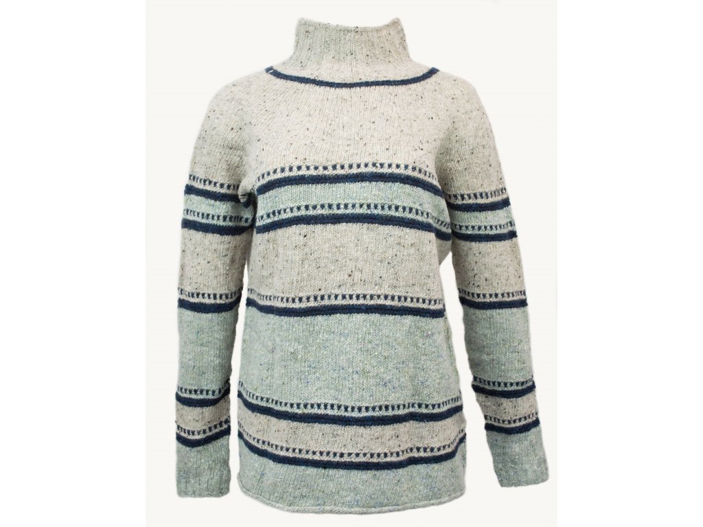 Nahtloser Damenpullover aus DONEGAL-Garn. Er ist eines der meistverkauften Modelle in Großbritannien. Der Pullover zeichnet sich durch seinen lässigen Schnitt, die Tunika-Länge und den Stehkragen aus. Die lockere Passform und die Leichtigkeit des Pullovers ermöglichen das Übereinanderziehen einzelner Kleidungsstücke. Das Donegal-Garn verleiht dem Pullover durch die vielen bunten Rippen ein handgestricktes Aussehen.