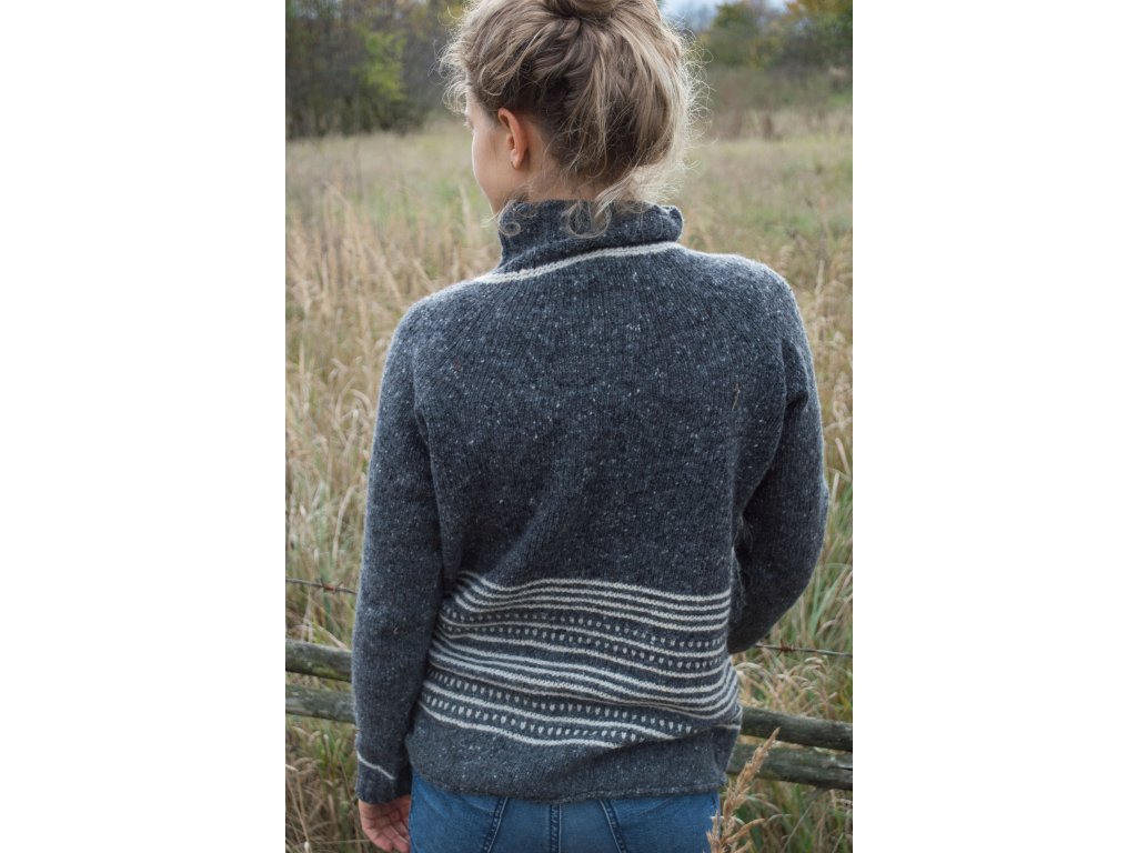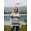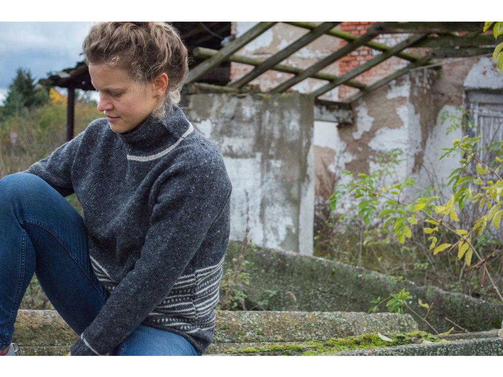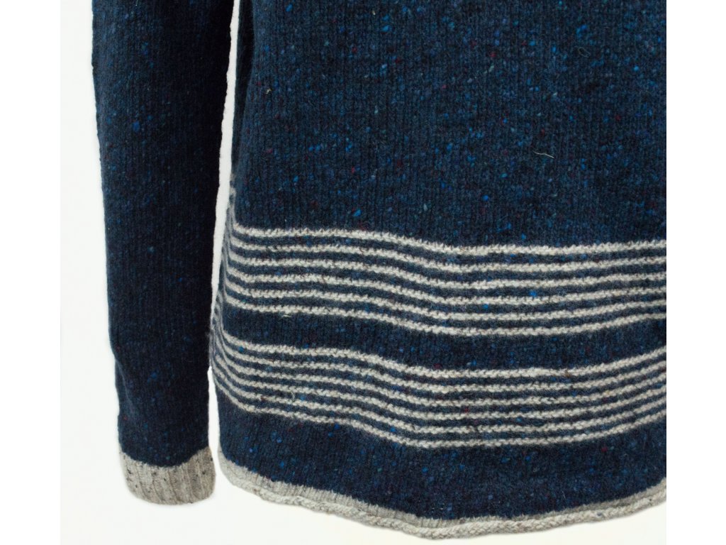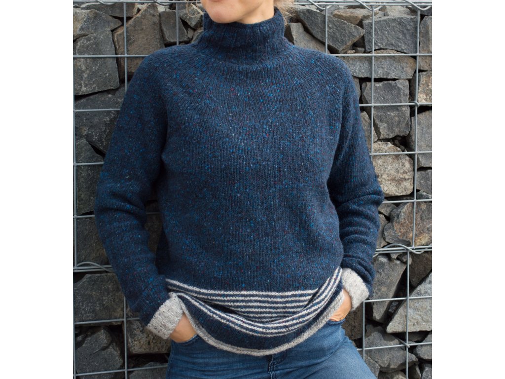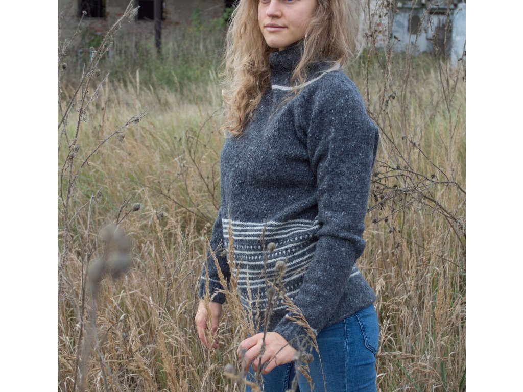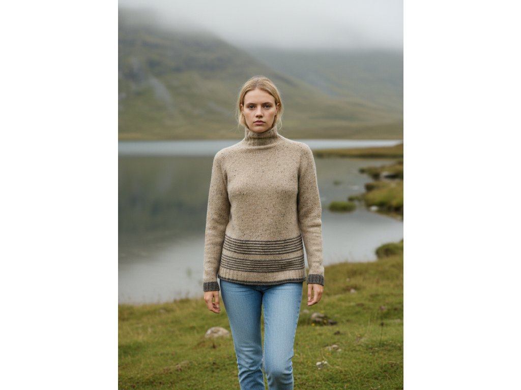 Nahtloser Damenpullover aus DONEGAL-Garn. Er ist eines der meistverkauften Modelle in Großbritannien. Der Pullover zeichnet sich durch seinen lässigen Schnitt, die Tunika-Länge und den Stehkragen aus. Die lockere Passform und die Leichtigkeit des Pullovers ermöglichen das Übereinanderziehen einzelner Kleidungsstücke. Das Donegal-Garn verleiht dem Pullover durch die vielen bunten Rippen ein handgestricktes Aussehen.