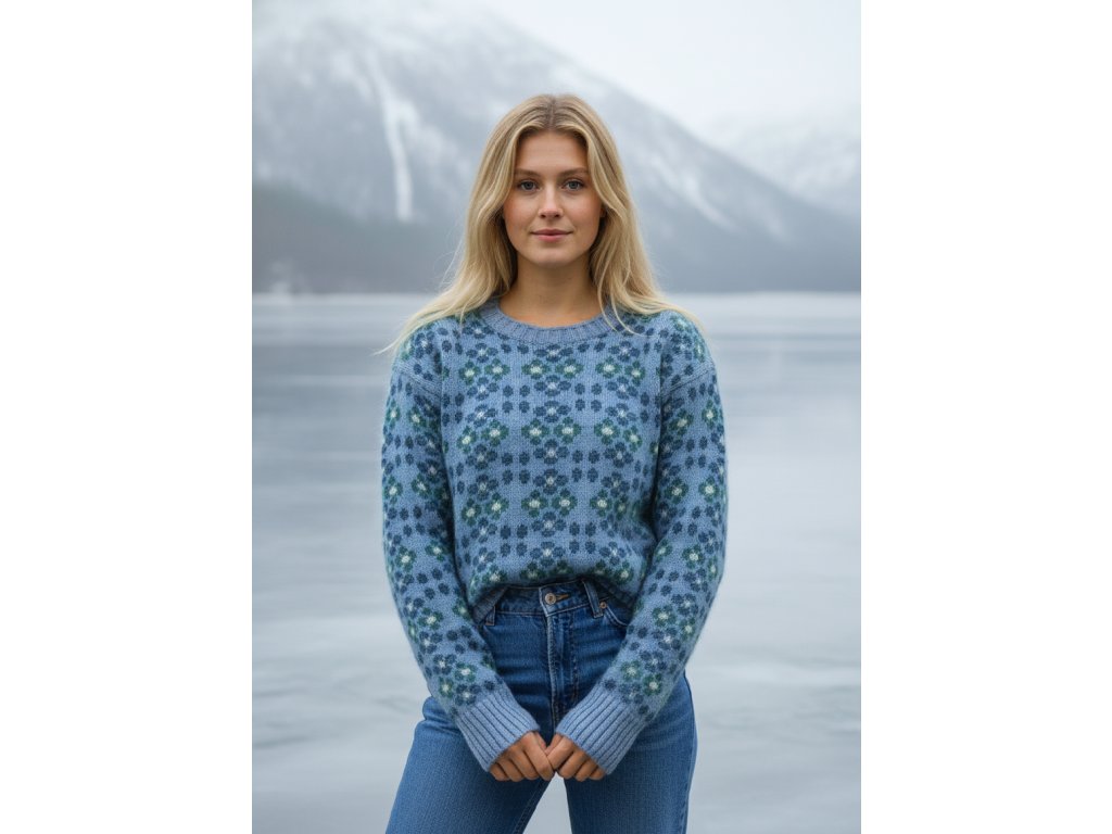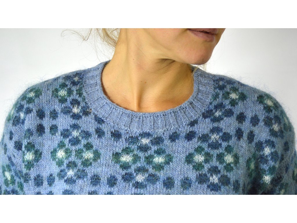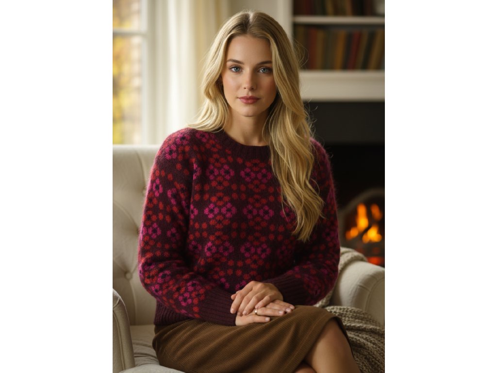 Dieser Damenpullover mit originellem Allover-Muster ist aus einer hochwertigen Mischung aus Shetlandwolle und Mohair gefertigt. Die Kombination dieser Garne sorgt für außergewöhnliche Wärme, Leichtigkeit und einen weichen Flor, der dem Pullover ein luxuriöses Aussehen verleiht.