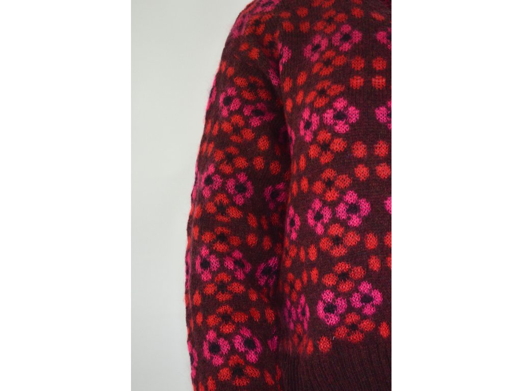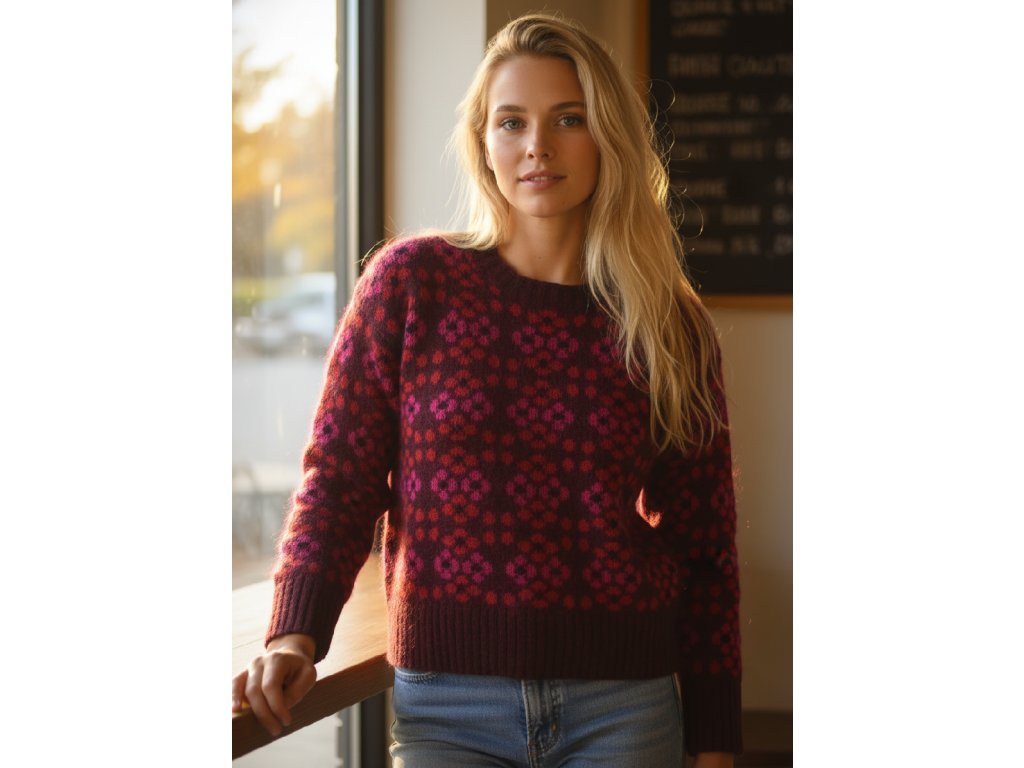 Der Pullover ist in zwei Farben erhältlich - in einem sanften, romantischen Hellblau und in einem kräftigen Burgunderrot. Jedes Stück wird in der Tschechischen Republik entworfen und hergestellt, wobei der Schwerpunkt auf traditioneller Strickkunst liegt.