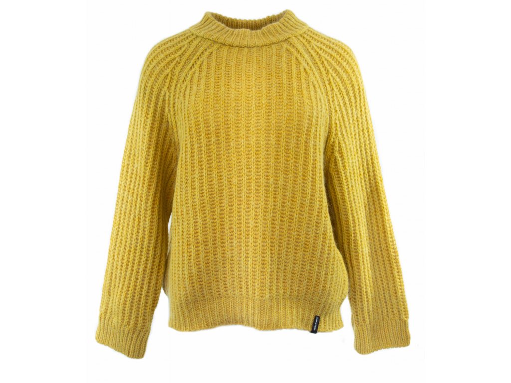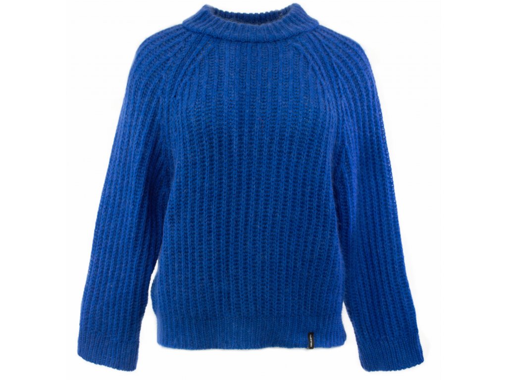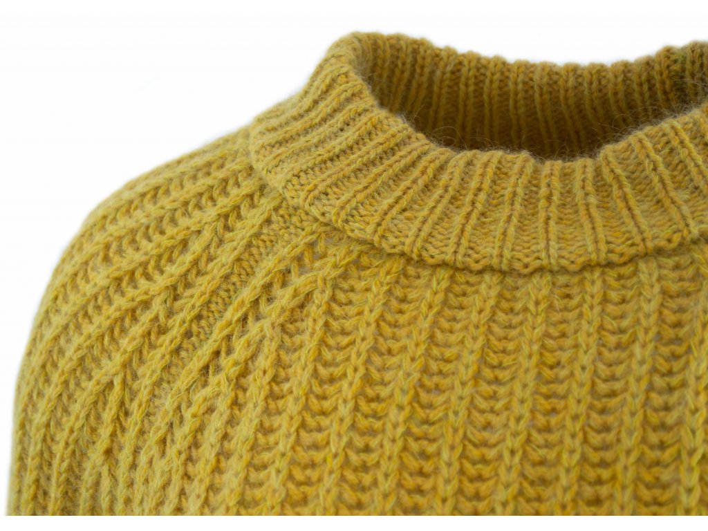 Der Damenstrickpullover ist aus Lambswool und Mohair gefertigt. Dank des groben Rippenstrickmusters wirkt der Pullover sehr flauschig und leicht. Die großen Strickmaschen in Kombination mit den leuchtenden und satten Farben ziehen die Aufmerksamkeit auf sich und machen den Pullover zeitlos.